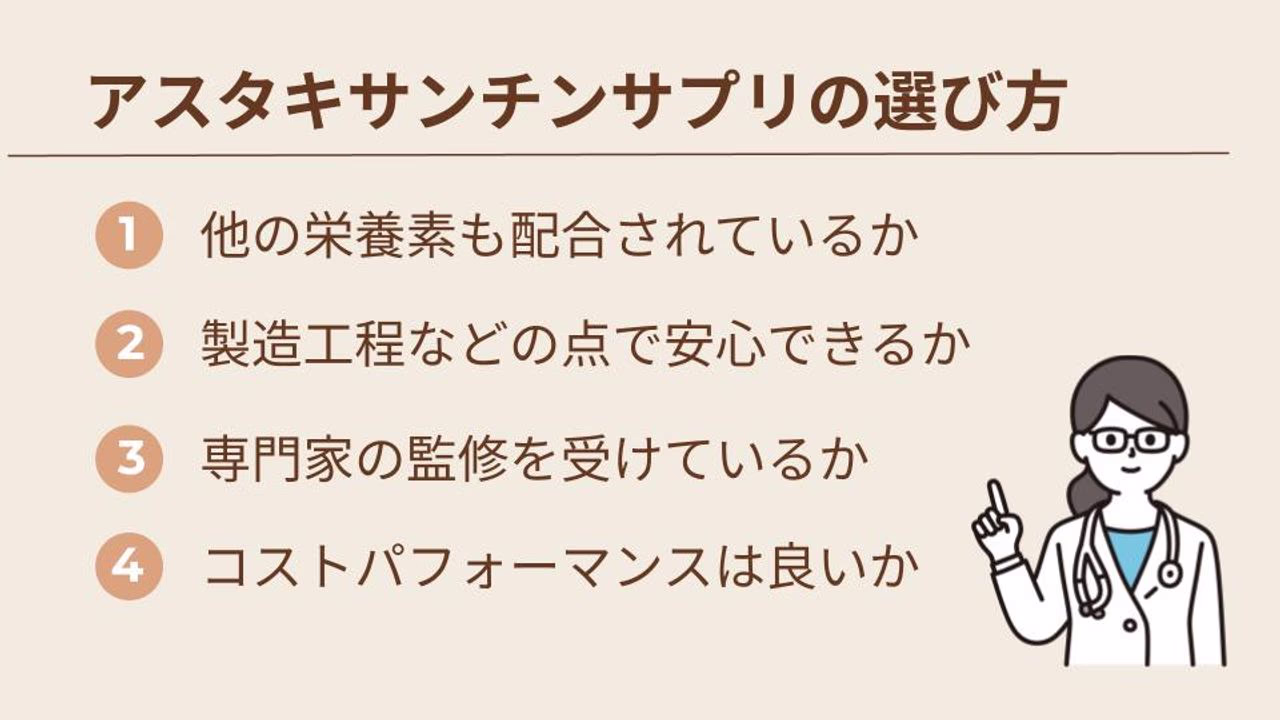 ここでは、後悔しないために知っておきたい、アスタキサンチンサプリの選び方のポイントを4つご紹介します。