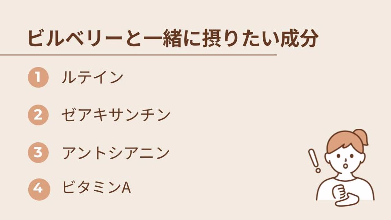 ビルベリーは他の目に良い成分と一緒に摂ることで、さらにパワーを底上げすることが期待できます。それぞれの成分には得意分野があり、組み合わせることで多角的に目をケアできるからです。