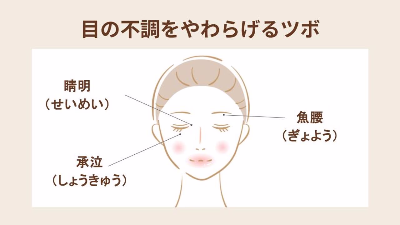 眉頭の内側にある「睛明(せいめい)」や、目の真下の「承泣(しょうきゅう)」といったツボを、イタ気持ちいいくらいの強さで優しく押してみましょう。
