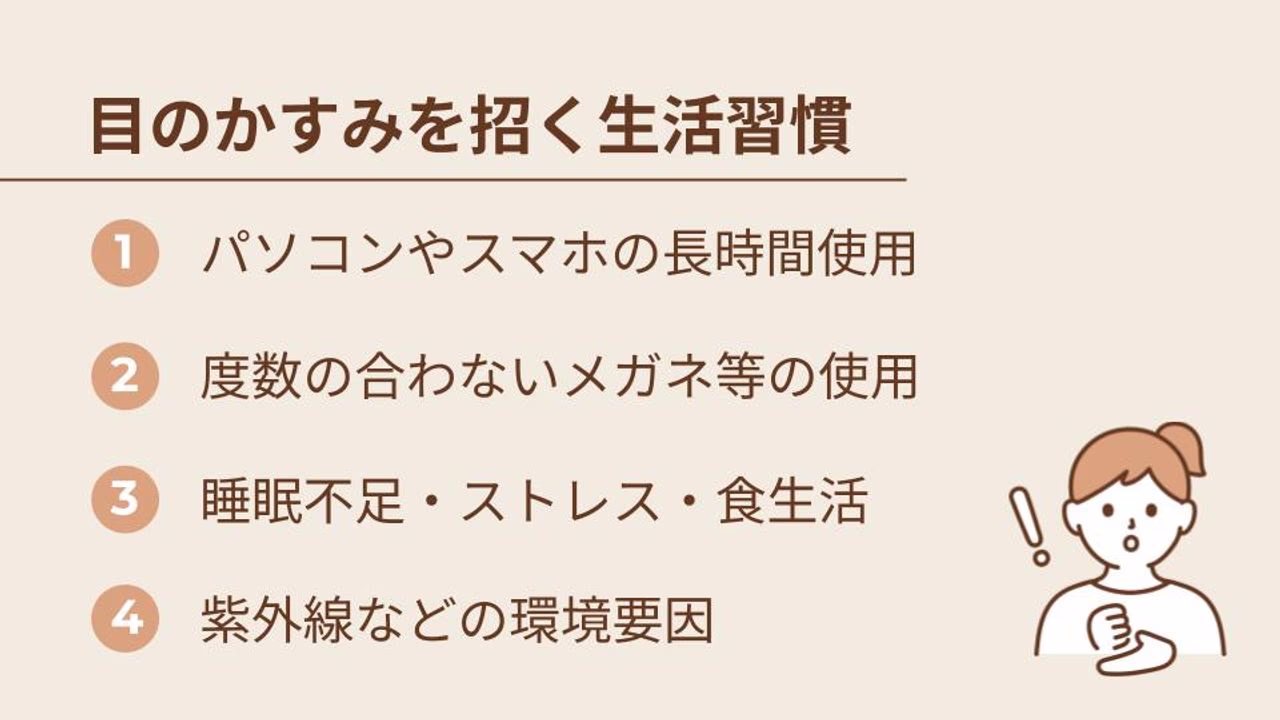 目がかすむ原因は、加齢や病気だけではありません。実は、私たちが毎日何気なく送っている生活習慣の中に、知らず知らずのうちに目に負担をかけ、かすみ目を引き起こす原因が潜んでいることがあります。