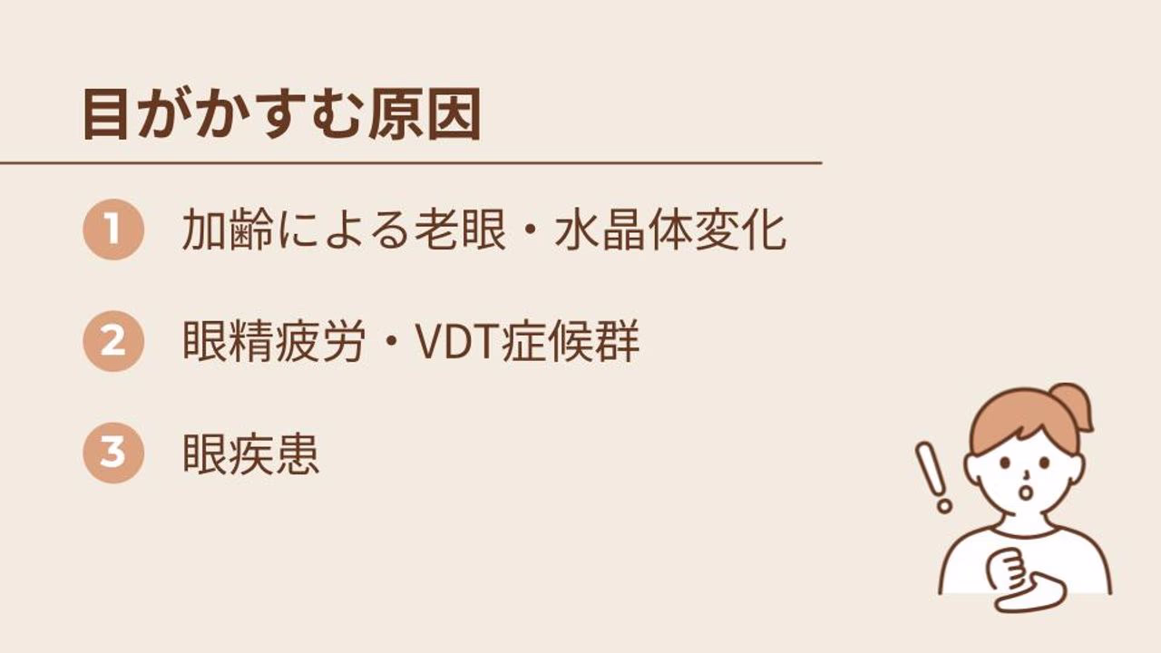 目がかすむ原因は、加齢によるものから、PC・スマホの使いすぎといった生活習慣、さらには白内障や緑内障といった病気のサインまで、実にさまざまです。
