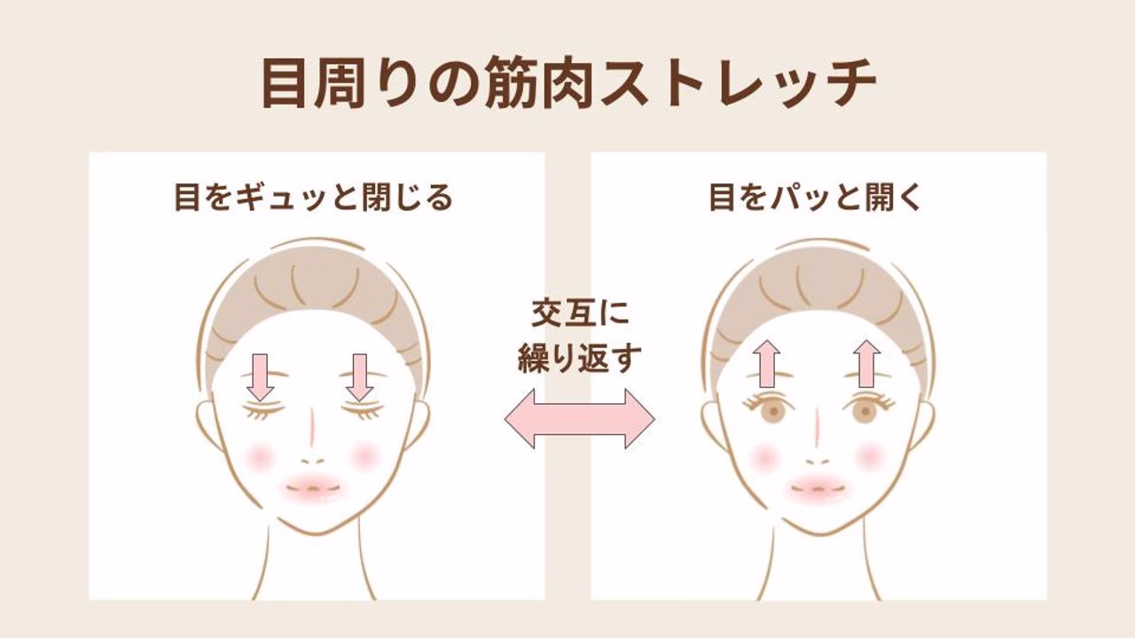 目をぎゅっと強く閉じて2秒キープ。その後、パッと大きく見開いて2秒キープします。これを3~5回繰り返すことで、目の周りの筋肉が刺激されます。