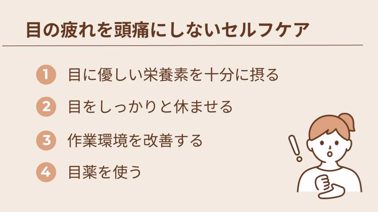 このような工夫をするだけで、首や肩への負担も軽減され、疲れ目による頭痛への対策ができるでしょう。