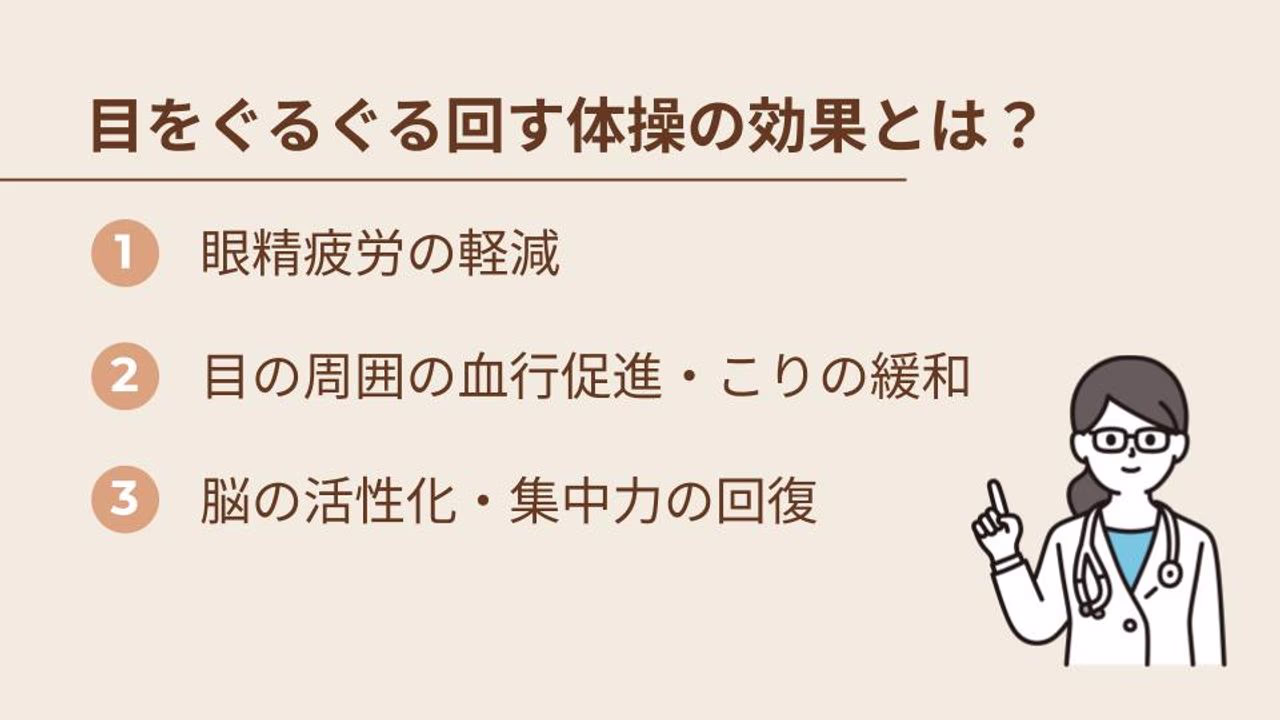目をぐるぐる回す体操は、目の周りの筋肉をほぐし、血行を促進することで、眼精疲労の軽減につながるといわれています。