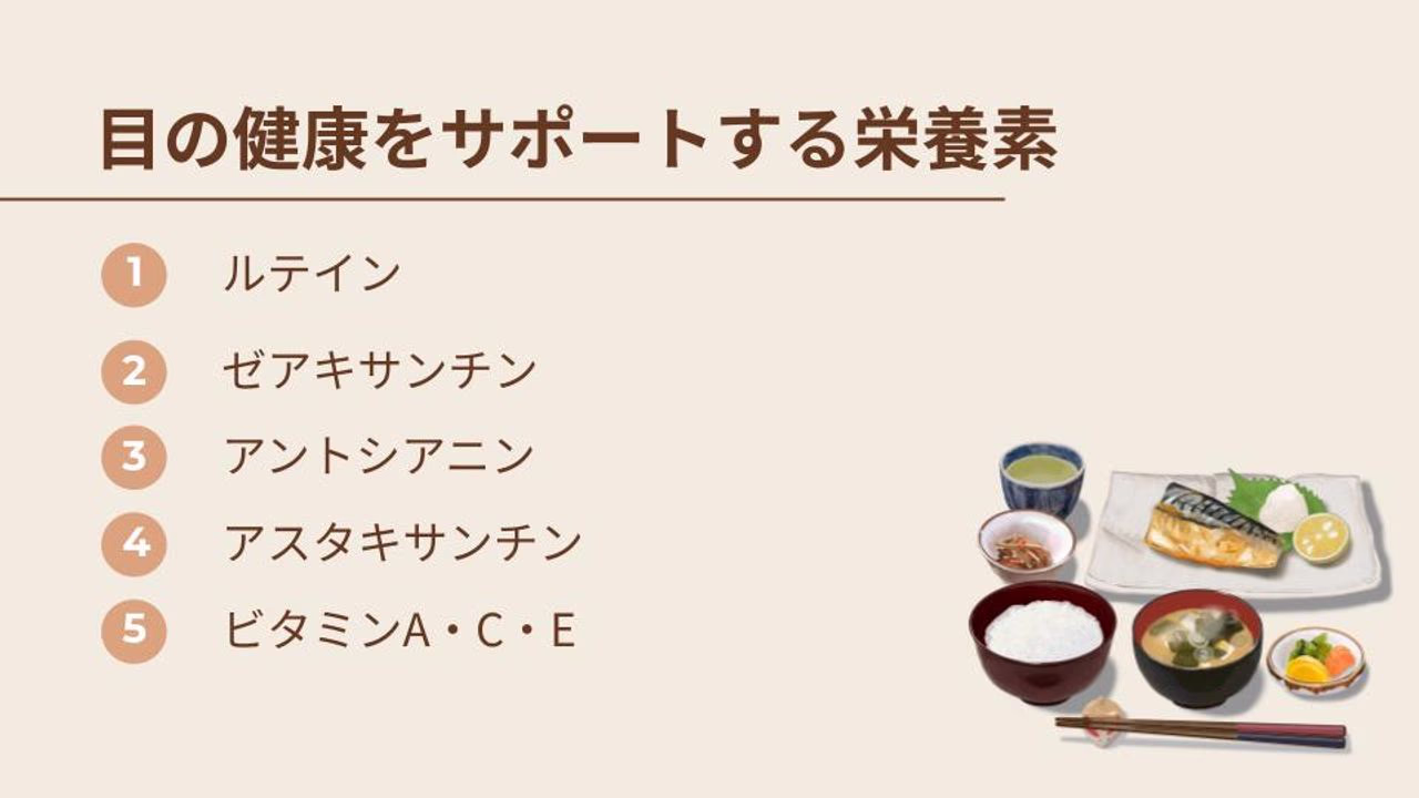定期的な目の休憩や、デスク周りの環境の見直しに加え、ルテインやビタミン類など、目に優しい栄養素を食事やサプリメントで意識的に補いましょう。