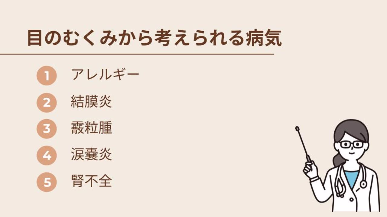 目のむくみは単なる体調の変化だけでなく、特定の疾患が原因となって引き起こされることがあります。もちろん、すべてが深刻な病気というわけではありません。しかし、可能性を知っておくことは安心感につながります。