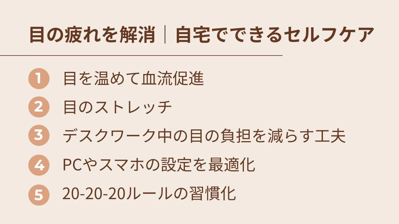 - 目の疲れを解消するには?自宅でできるセルフケア