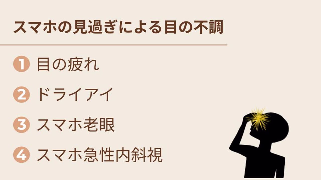 スマホなどの画面の見過ぎは目の疲れ、ドライアイ、スマホ老眼やスマホ内斜視などの原因となります。また、目の疲れを放置すると、眼精疲労になり、頭痛や肩こりなど、目以外の不調にもつながります。