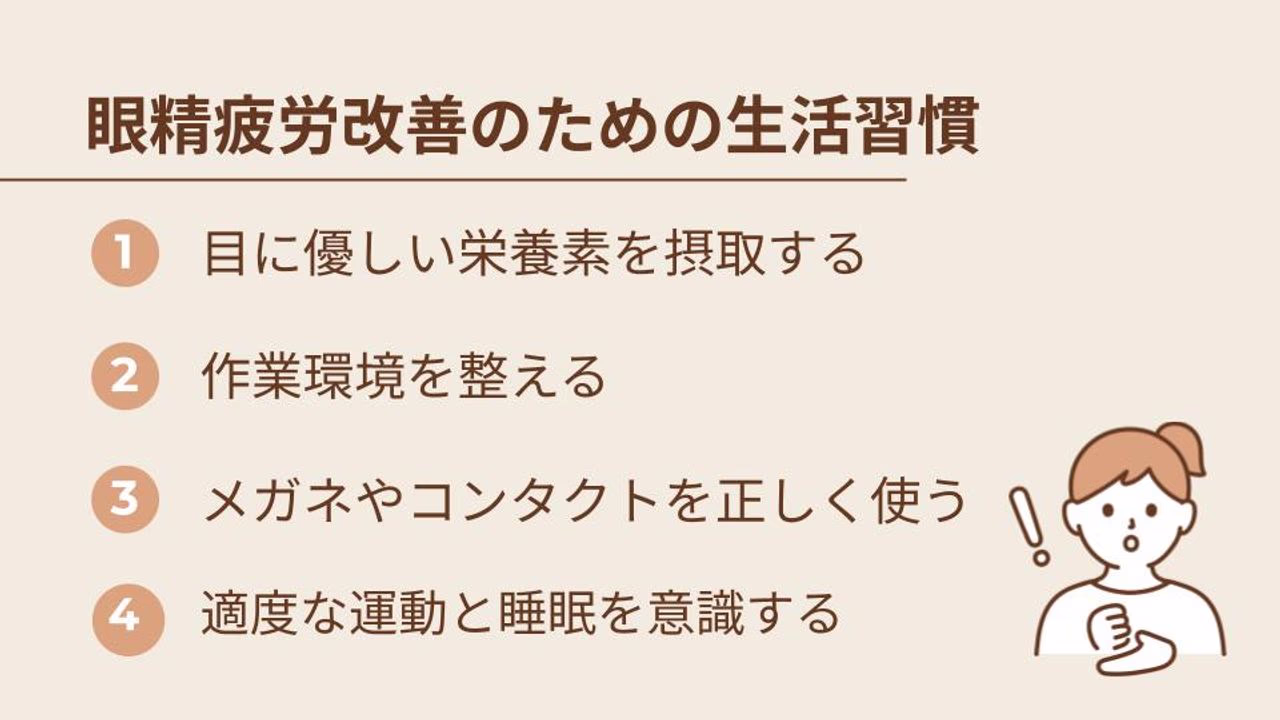 眼精疲労をやわらげるには、一時的なケアだけでなく、日々の生活習慣を見直すことが大切です。
