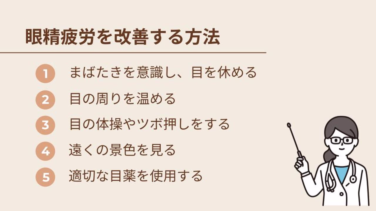 ここでは、今日からすぐに始められる、眼精疲労の症状を和らげるためのさまざまな方法を解説します。