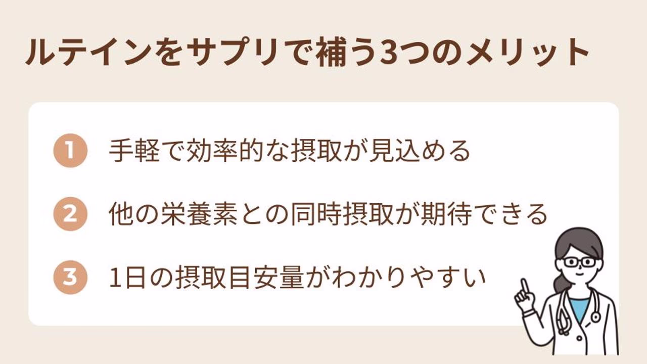 サプリメントでルテインを補うと、以下の3つのメリットがあります。