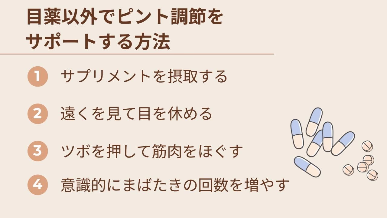 そこで今回は、ピント調節をサポートしたい方に向けて、目薬の選び方や、目薬以外のケア方法についてご紹介します。快適な視界を保つために、自分の目の状態に合った方法を見つけてみましょう。
