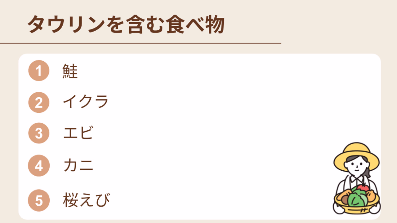 タウリンは疲労回復や抗酸化作用が強く、目の疲れの軽減に役立つといわれています。また、網膜の機能維持や視力低下の予防、ストレス緩和や神経の働きを助ける役割もあります。