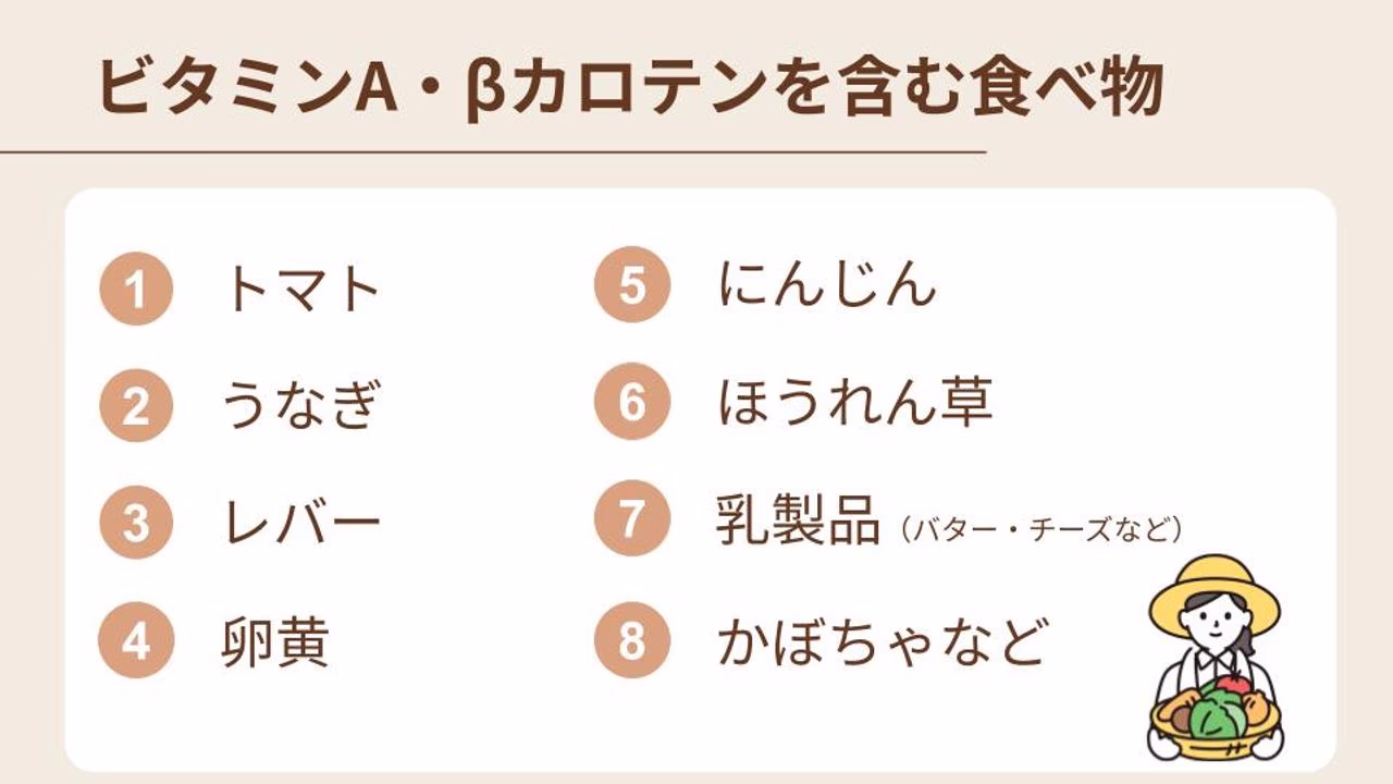 ビタミンA:粘膜や皮膚、目の健康、暗がりでの視力の維持に働きかける