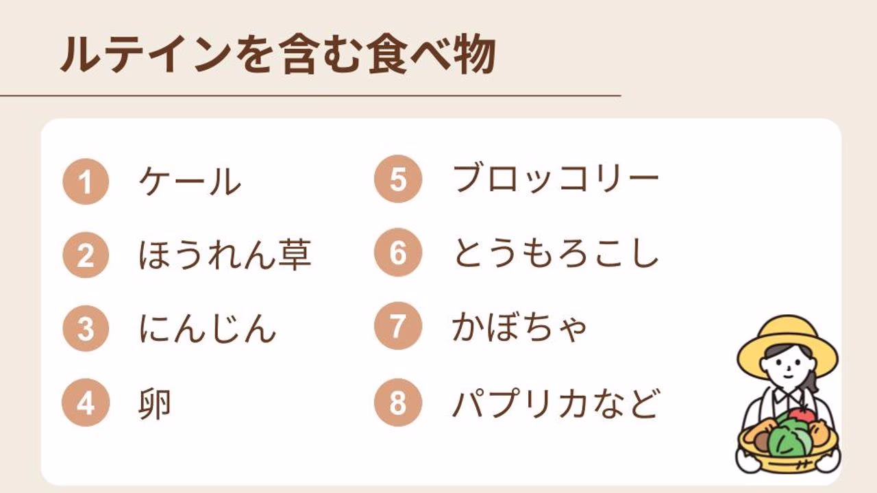 なお、ルテインは体内では合成できないため、食事やサプリメントから摂取する必要があります。