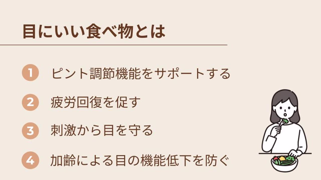 目に良いとされる食べ物には、以下のような働きをもつものがあります。
