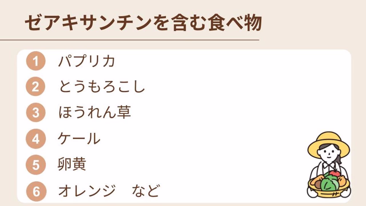 ゼアキサンチンは、目の網膜(特に黄斑部)に多く存在し、ルテインと同様「黄斑色素」として目の健康維持に不可欠な成分です。