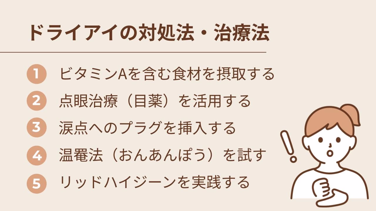 ドライアイへの対処法・治療法には以下のようなものがあります。