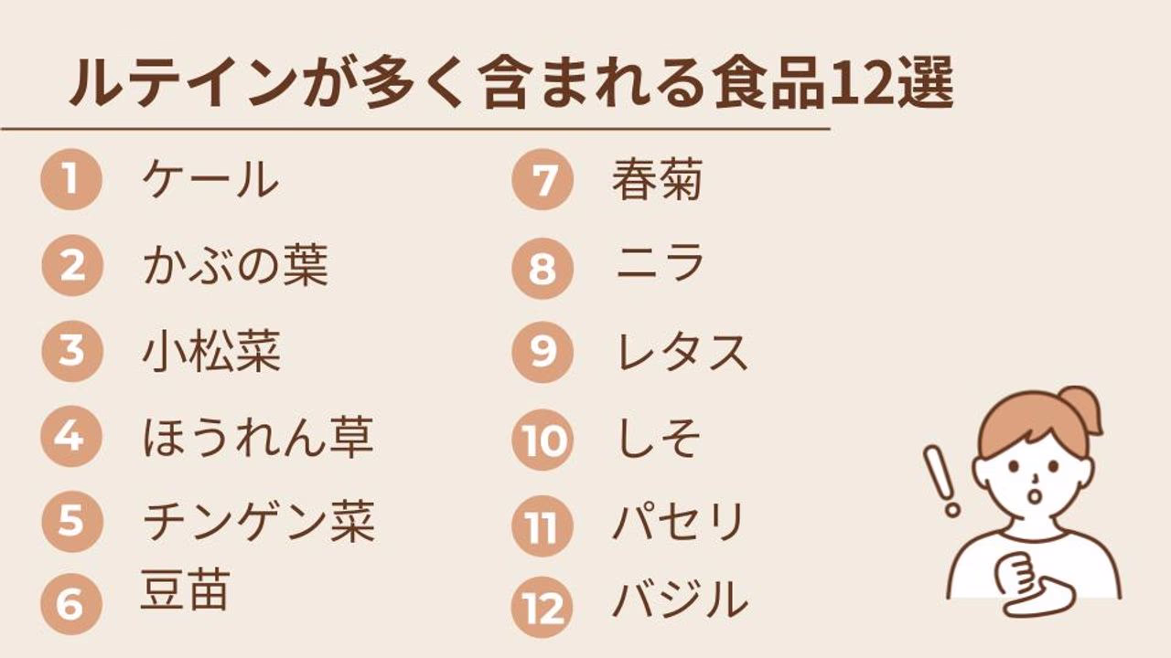 ルテインは目の健康維持のために、重要な役割を果たす栄養素です。緑黄色野菜、卵黄、果物などに多く含まれ、1日に6〜10mgの摂取がよいといわれています。