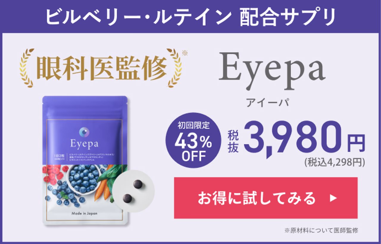 小腸からのルテイン吸収をサポートし、目に必要な栄養素を10種類以上含んだオールインワンサプリメント「Eyepa」もぜひ検討してみてください。