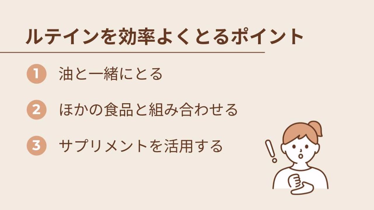 一般的にルテインの吸収率は10%と低いため、吸収率をサポートする方法を知っておくと効率のよい摂取につながります。