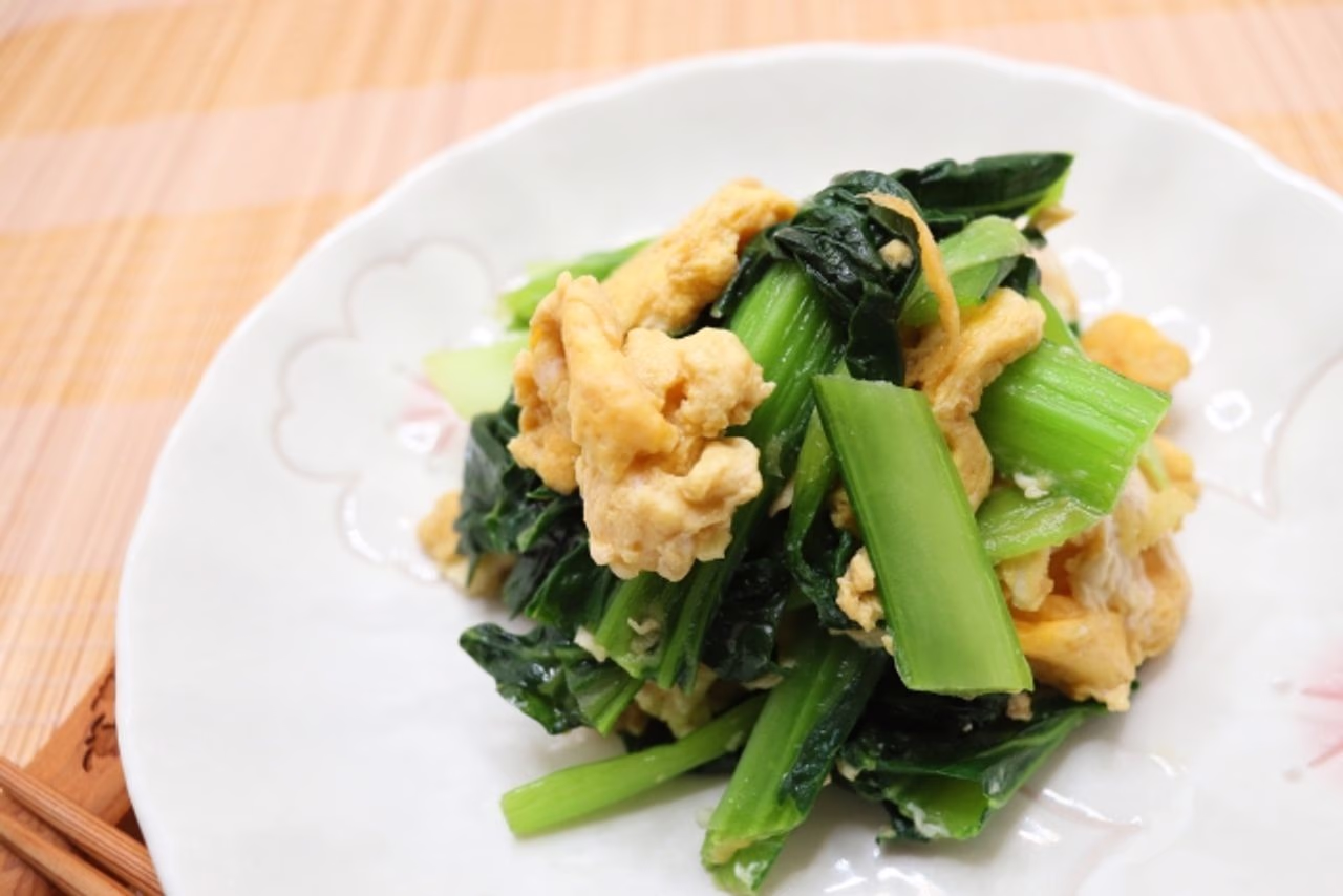 ルテインを多く含む小松菜と卵を組み合わせた、主菜にもおすすめの一品です。油に溶けやすい性質を持つルテインの吸収率アップも見込めます。