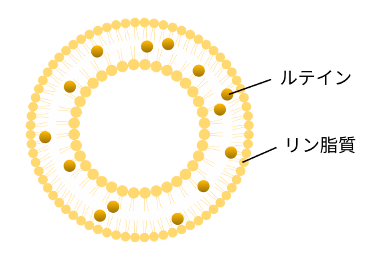 一般的なルテインは、胆のうから分泌される胆汁酸によってミセル化し、小腸の上皮細胞から吸収されますが、リポソーム化されたルテインはリン脂質のカプセルに包まれているため、ミセル化を待たずに吸収できるのがメリットです。