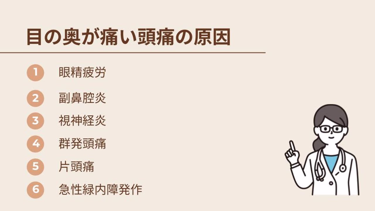 目の奥が痛いと感じる頭痛には、いくつかの代表的な原因が隠れています。ご自身の今の状態と照らし合わせながら、これから紹介する疾患や体調の変化について、心当たりがないか確認してみてください。
