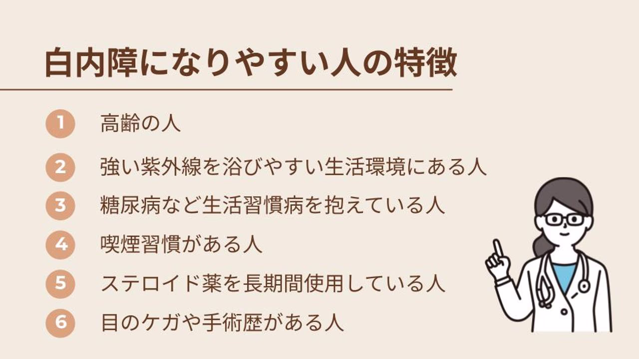 ここでは、どのような人が比較的早い段階で白内障になりやすいのか、また進行しやすい傾向にあるのか、その具体的な特徴について解説します。