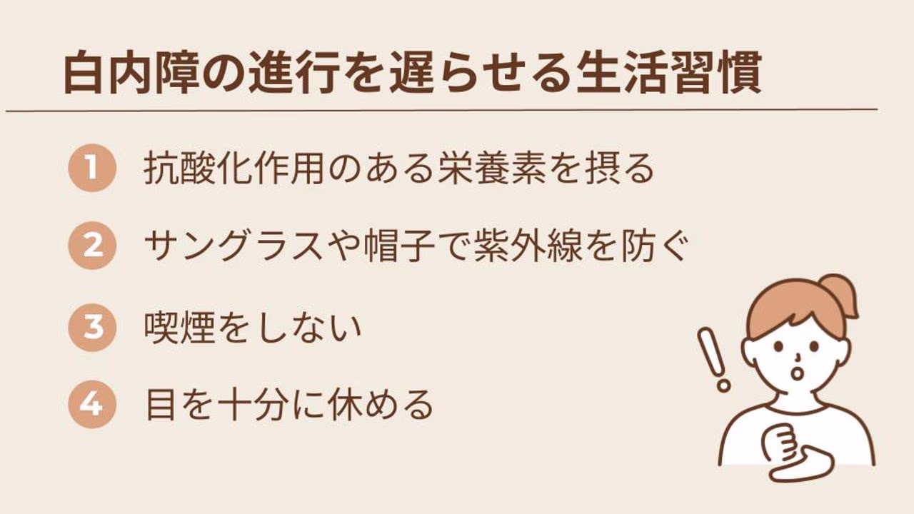 白内障になりやすい要因を持っていたとしても、日々の心がけ次第で進行を緩やかにすることができるといわれています。