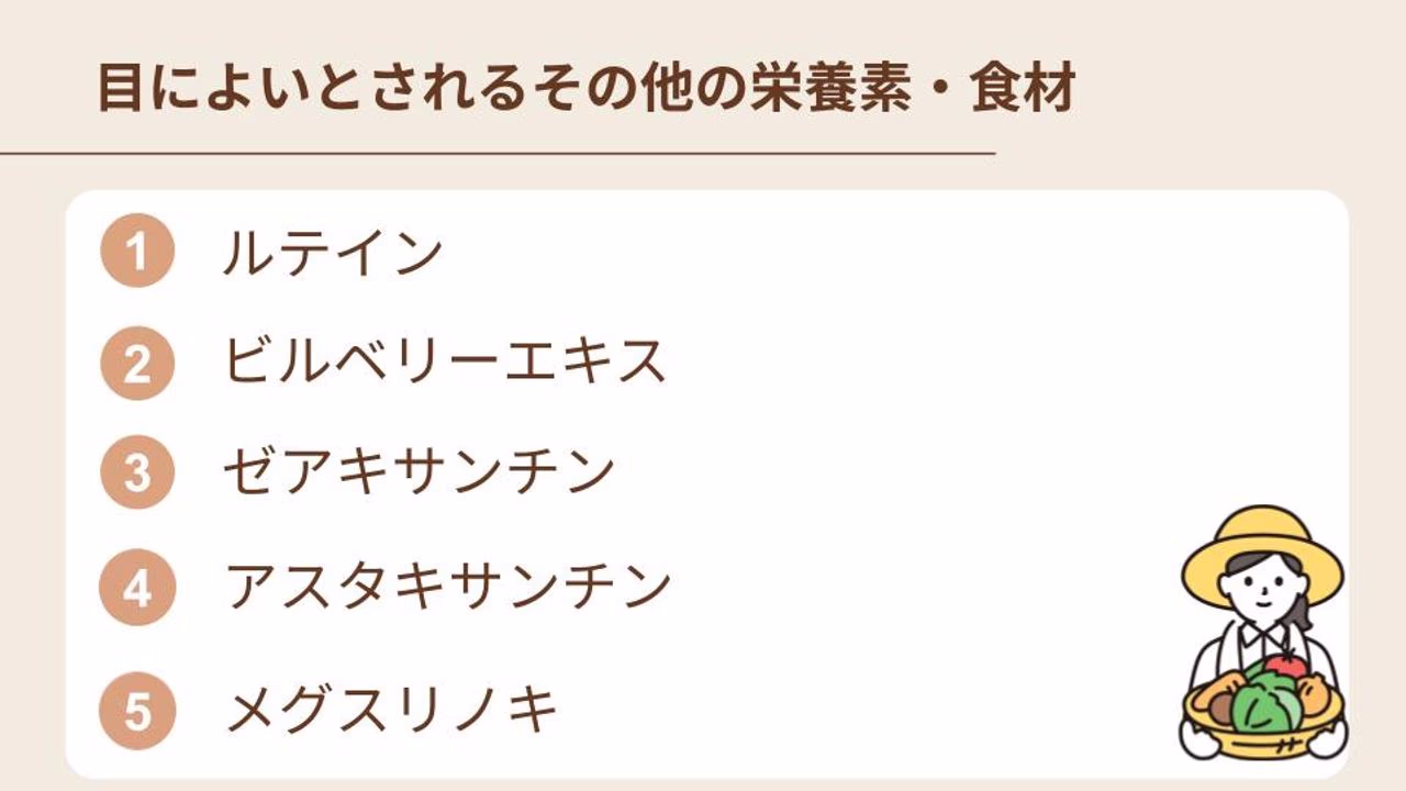抗酸化作用が強く、ブルーライトなどの光刺激から目を保護するとされています。網膜の中心である黄斑部を光や活性酸素から守る役割もあり、日常的に意識して取り入れることが望ましい栄養素です。