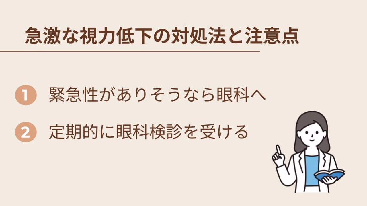 実際に「急激に見えにくくなった」と感じたとき、私たちはどのように行動すべきなのでしょうか。
