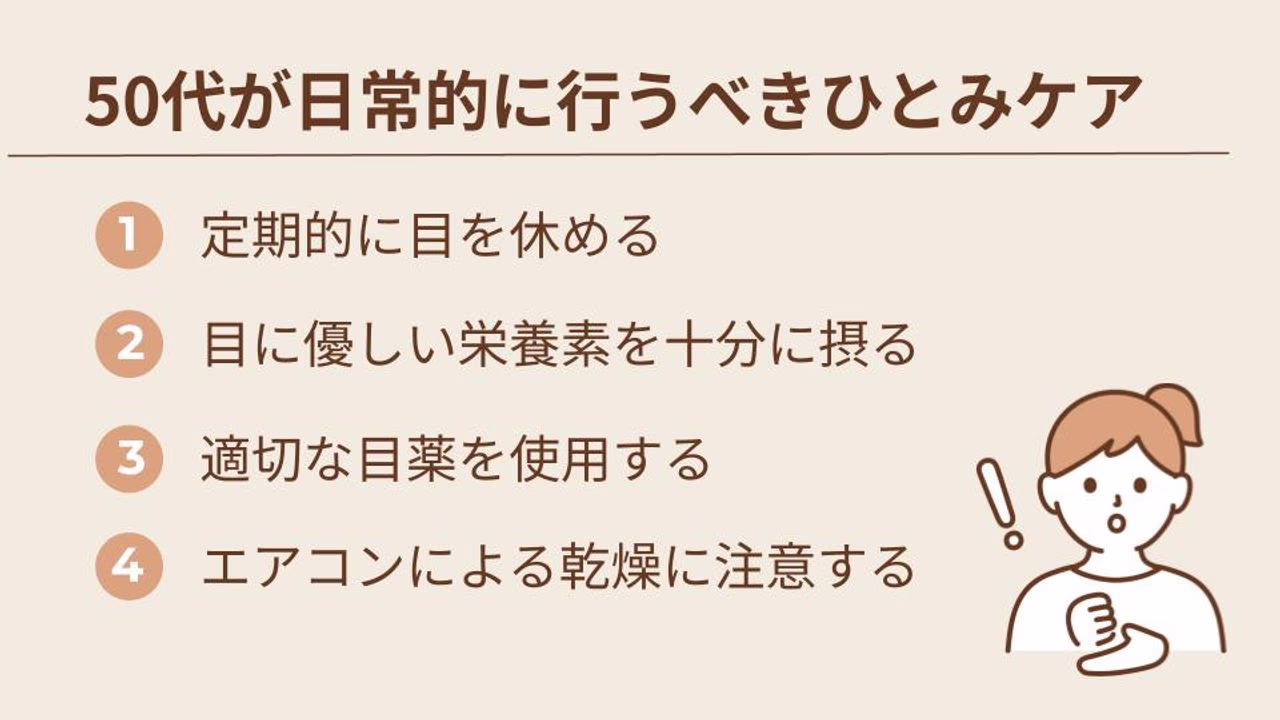 50代の目は回復力も落ちてきているため、意識的に休息をとって目をリラックスさせることが大切です。