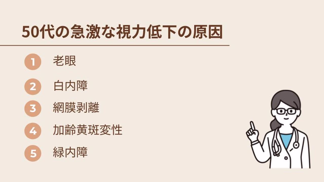 50代になってから「急激に視力が落ちた」と感じる場合、そこにはいくつかの原因が考えられます。