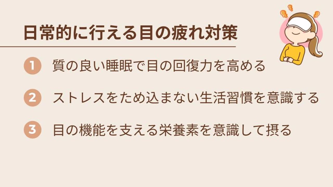 目の疲れは放置すると、見た目の印象や集中力の低下につながるため、日常的なケアが重要です。ここでは、目の疲れを軽減するために日常的に行える対策について解説します。