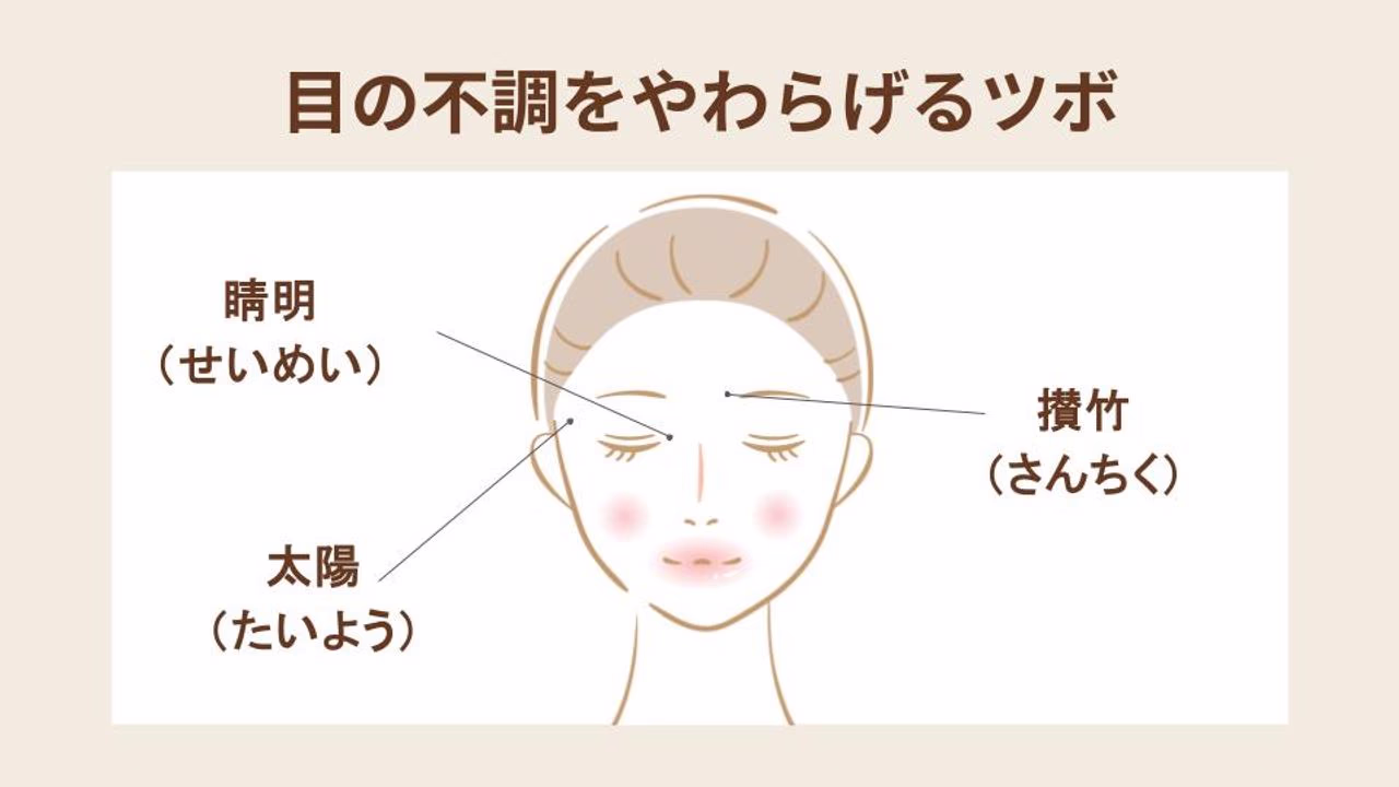 - 3太陽(たいよう):目尻と眉尻の中間で、目の奥の疲れやしょぼしょぼ感を和らげる