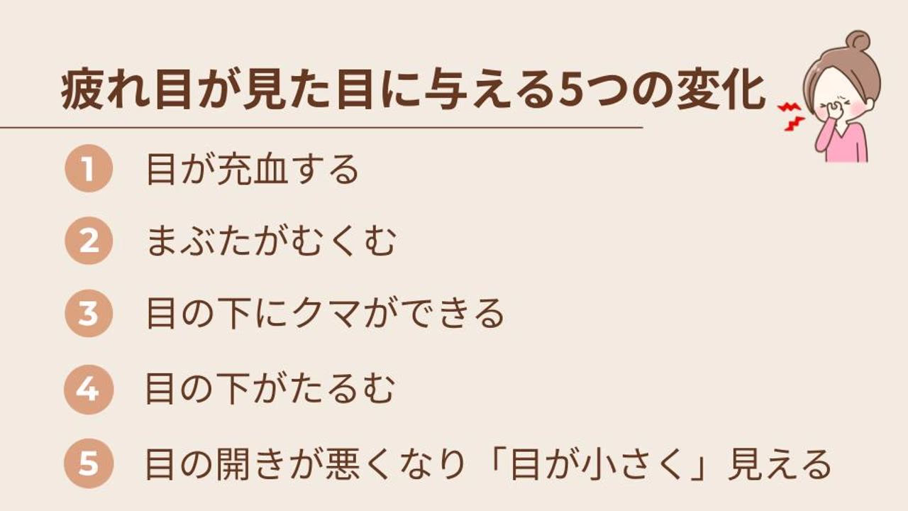 目の疲れは自覚しづらい反面、顔の印象には意外なほど大きな影響を与えます。ここでは、疲れ目によって起こりやすい5つの外見的変化について解説します。