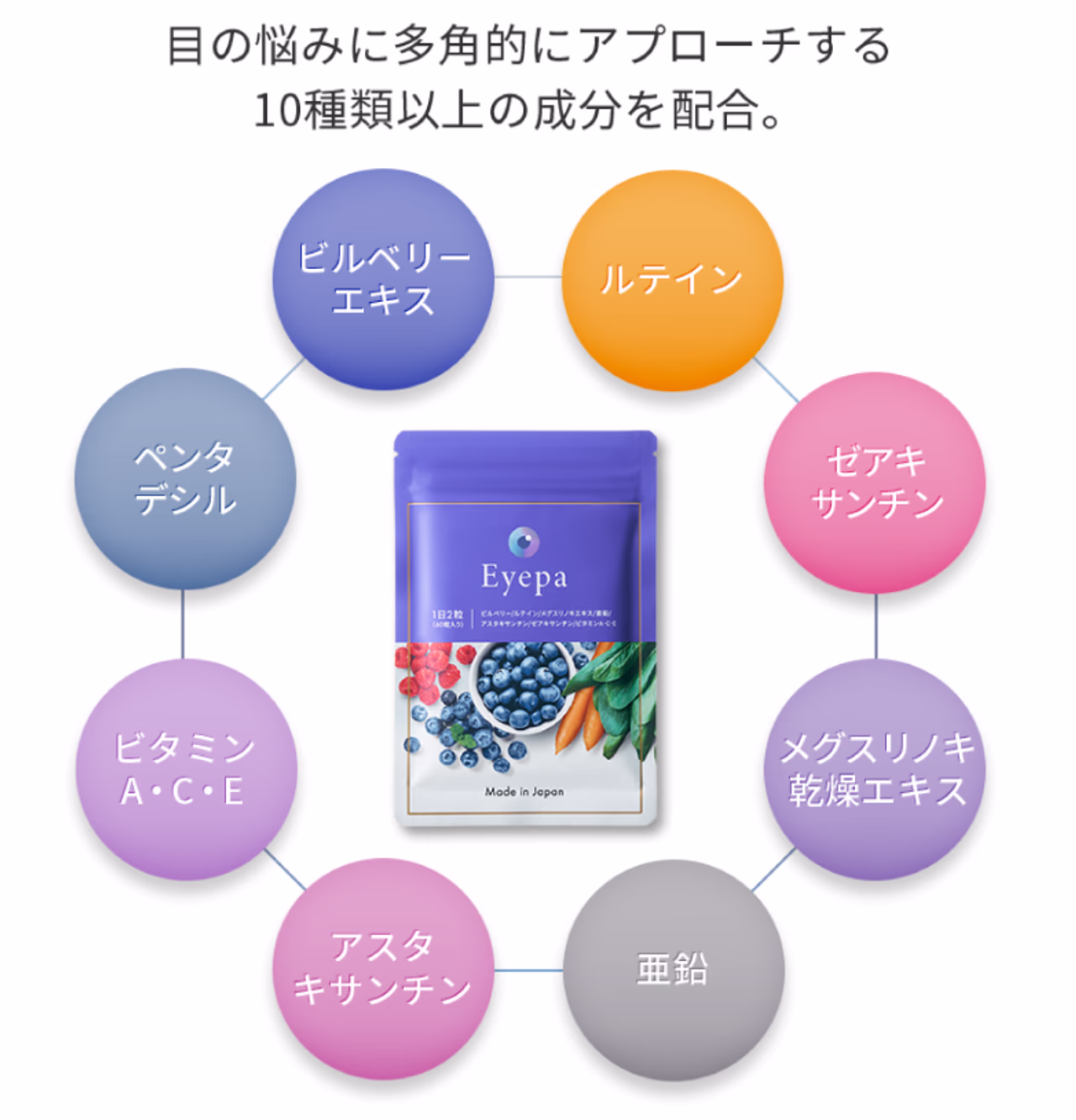 【ひとみケアサプリEyepa監修・眼科医】 日々の生活の中で、バランスよく必要な栄養素を摂取することも大切なのです。Eyepaは眼の潤いをサポートしてくれるビルベリーを始め、抗酸化成分であるルテインやアスタキサンチン、その他多様な成分がオールインワンに含まれており、非常に理にかなった製品だと思います。