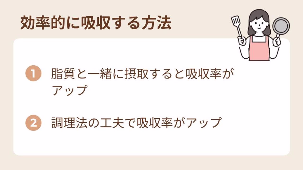 少し油を使って加熱すると吸収率もアップするので、炒めものやオーブン焼きなどもおすすめです。