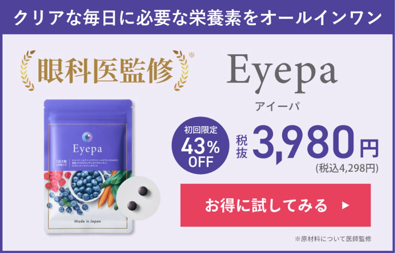 ゼアキサンチンを取るなら、オールインワンサプリ「Eyepa」がおすすめです。Eyepaは、原材料について眼科医監修のもと、パソコンやスマホなどで目を酷使する現代人が積極的に取りたい成分が詰まっています。