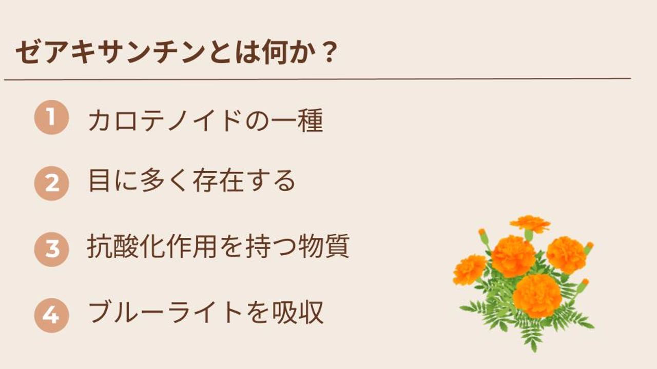 ゼアキサンチンは人の目に存在する色素ですが、体内では作れず、加齢により減少します。