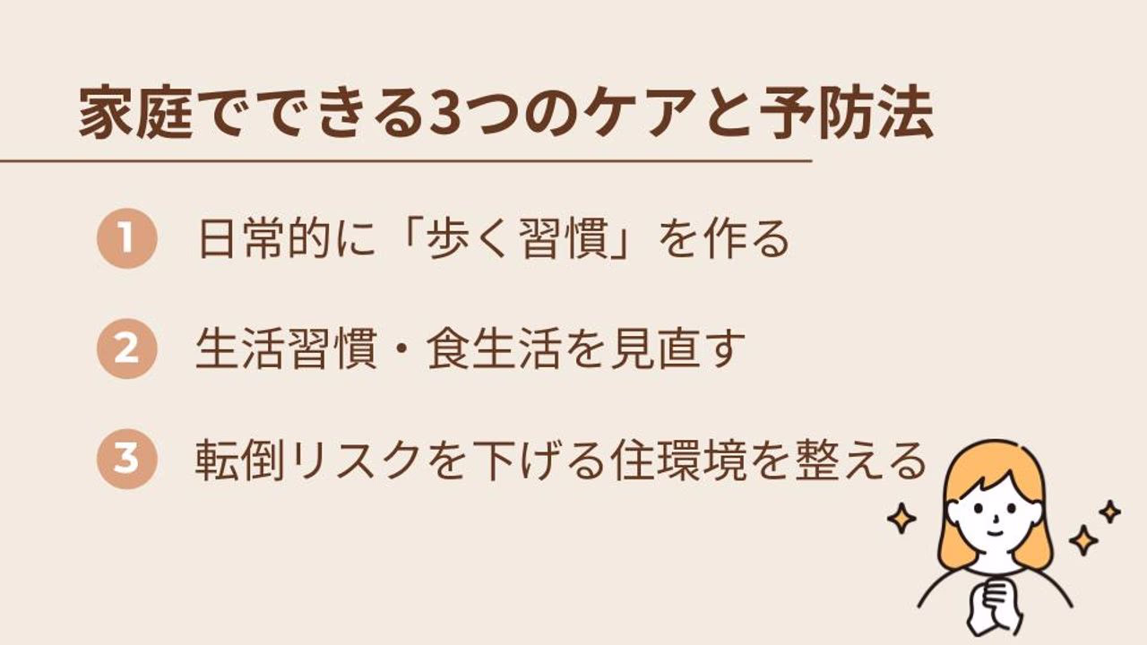 変化に少し戸惑うかもしれませんが、家族が日常の中で「歩き出し」「歩幅」「つまずきやすさ」などをさりげなく観察するだけでも、小さなサインに気付けます。