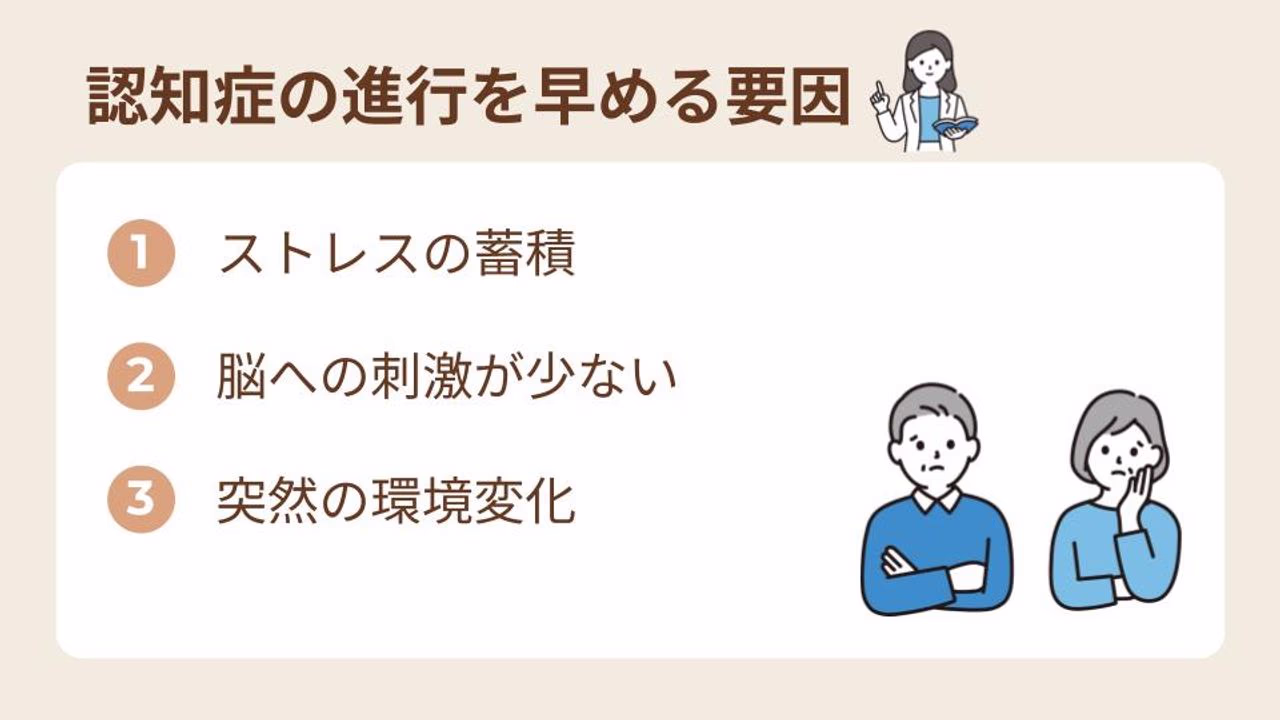 認知症は、脳の機能低下だけでなく、生活環境や心理的な影響によっても進行が早まることがあります。ここでは、進行を加速させやすい主な要因を解説します。