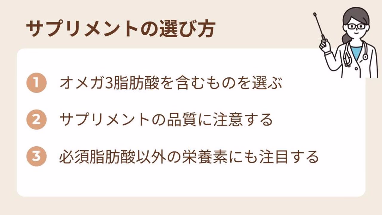 必須脂肪酸を含むサプリメントを選ぶ際は、以下のポイントを確認しましょう。