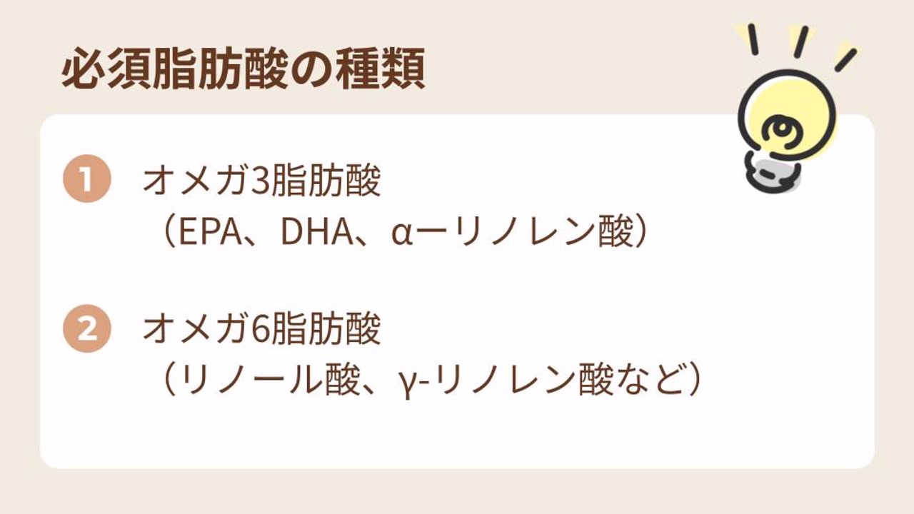 必須脂肪酸は不飽和脂肪酸の一種であり、オメガ3脂肪酸やオメガ6脂肪酸が該当します。