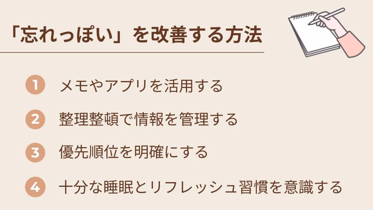ここでは、「忘れっぽい」を改善するための具体的な方法について解説します。