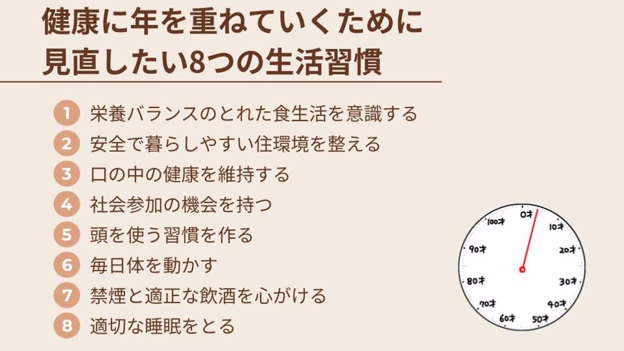 健康に年を重ねるためには、8つの生活習慣を見直していきましょう。全てを完璧に見直すのは難しいので、健康との関連が特に深い食生活から見直すのがおすすめです。