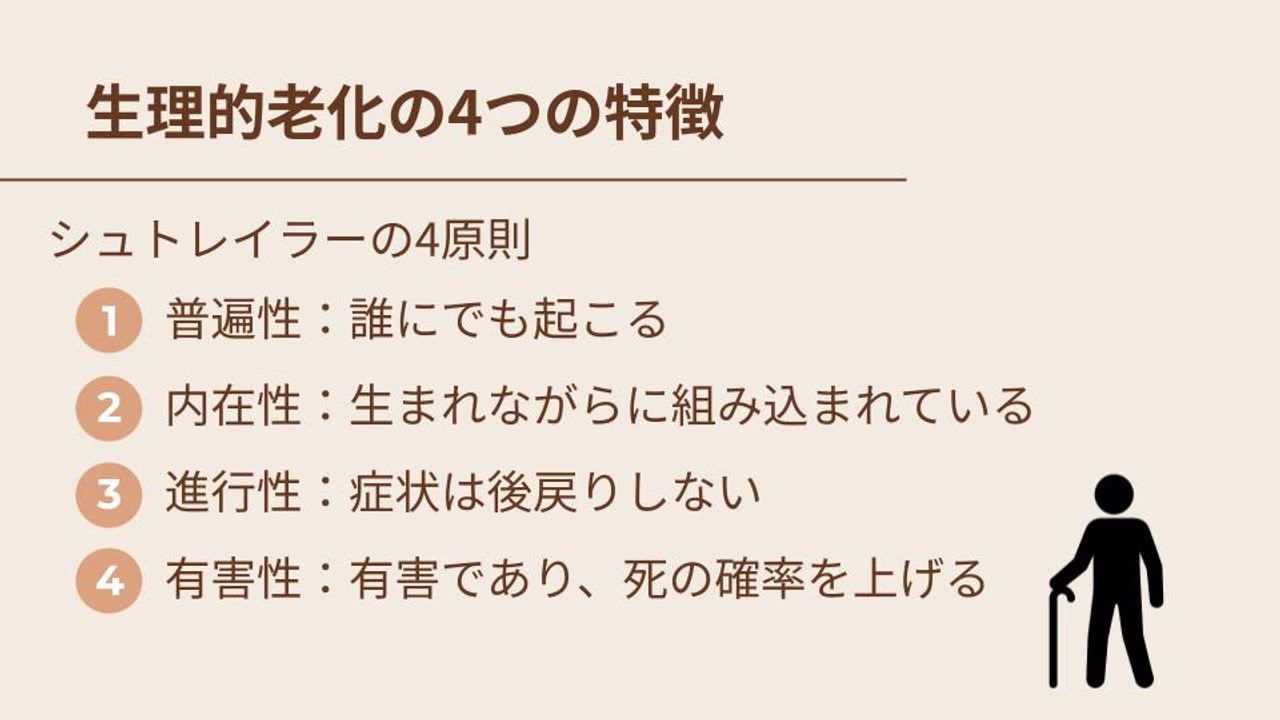 1つめの老化が「生理的老化」です。生理的老化には、アメリカの生物学者シュトレイラーが提唱した4つの原則があります。