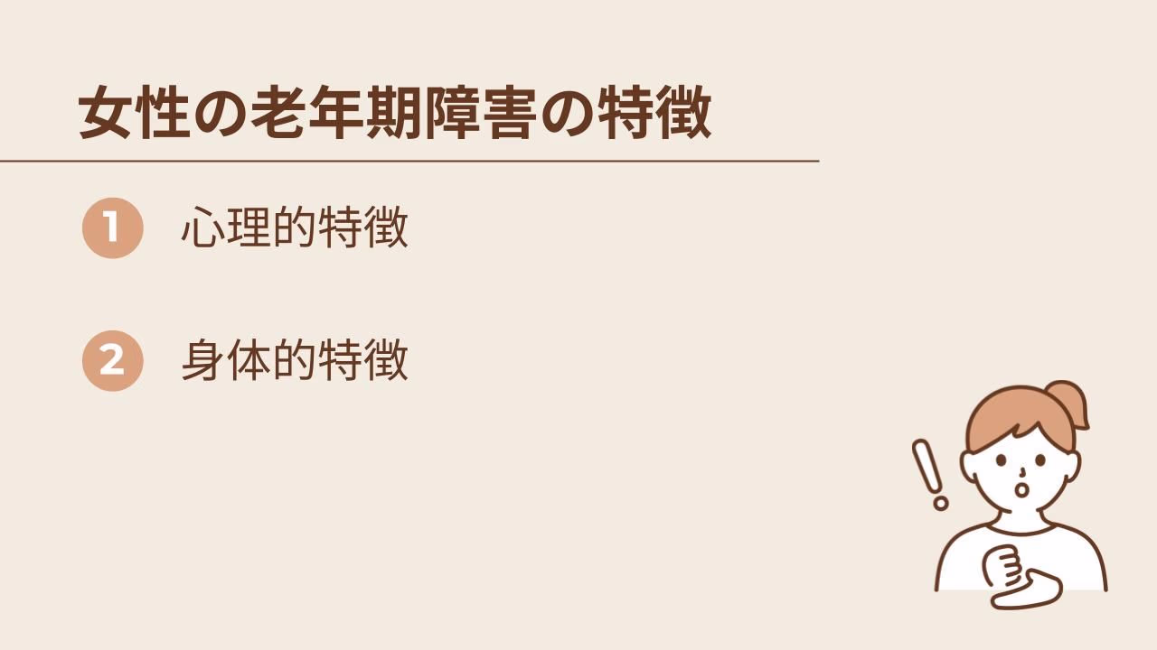 女性の老年期障害の特徴を、心理的、身体的の2つに分けて紹介します。