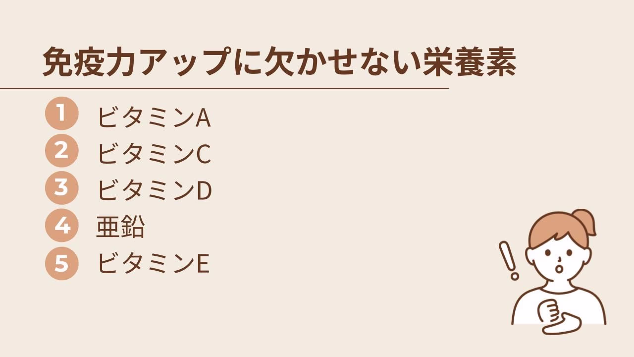 免疫力アップには、以下5つの栄養素が欠かせません。